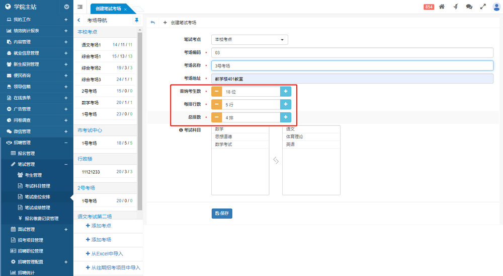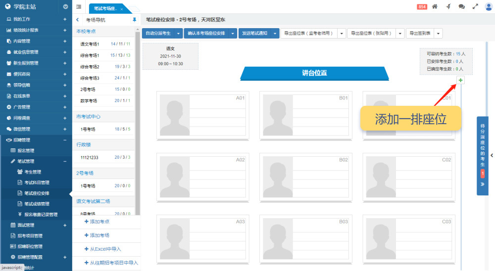 考點和考場的管理功能集成在“筆試座位安排”的考場導(dǎo)航中欄,無需單獨的管理菜單。