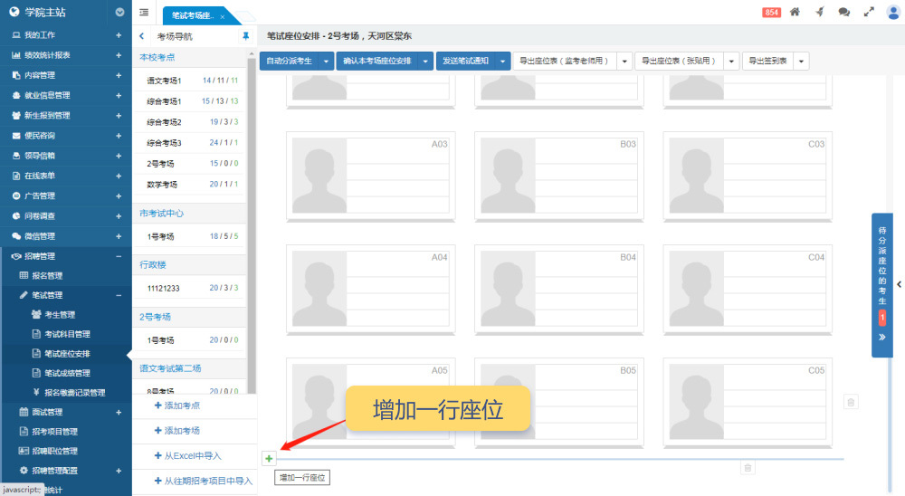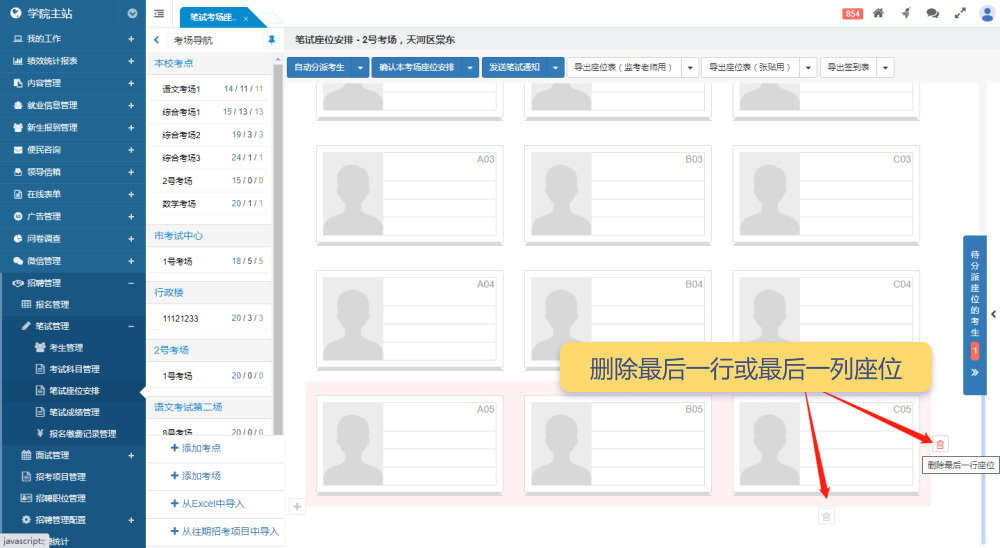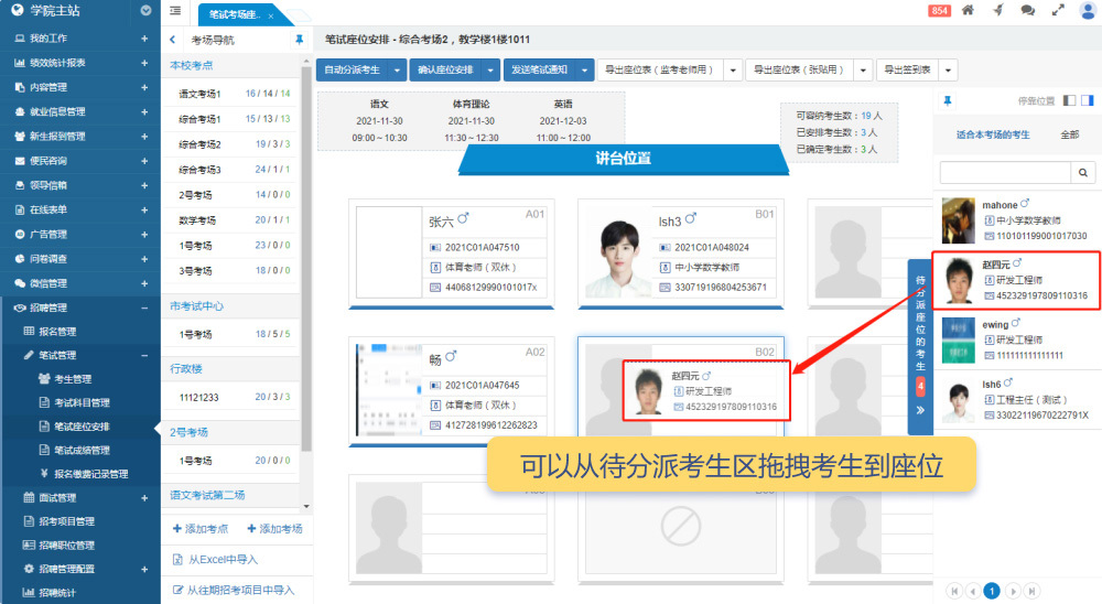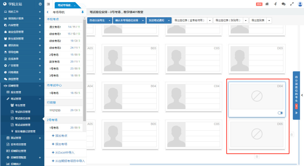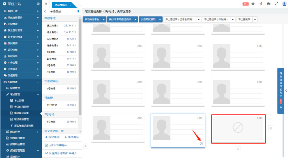 筆試考生管理界面類似于報名管理界面,中欄顯示本次招考項目的職位列表,每個職位后面顯示進(jìn)入筆試流程的考生總數(shù)。如果有“待安排座位”的考生,會有紅點進(jìn)行提醒。中欄頂部支持切換不同的招考項目。